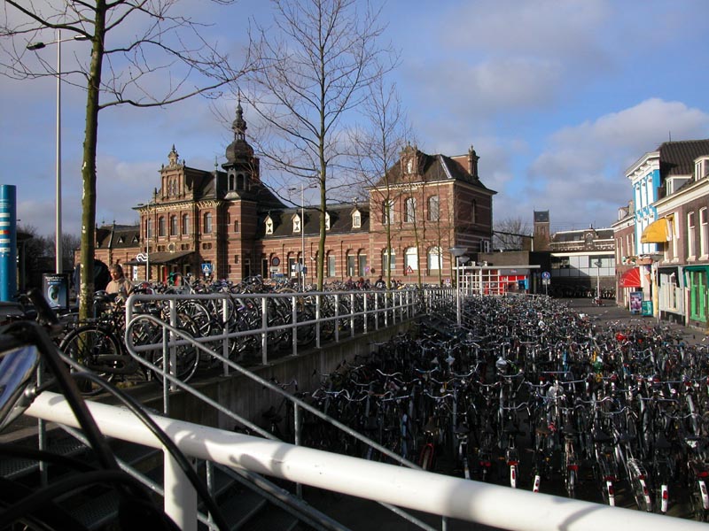 This is the railway station in Delft. There are no car parking places, only bicycle parking. There are many bicycles in front of the station that can’t be seen in this photo and many more around the sides and back. The internet café is the one with the green paint on the right, the marijuana café is next door and our apartment is just round the corner overlooking the canal. The bus terminal is in front of the station to the left and the tram runs on the other side of the canal in front of the station. The trains are fast, clean, frequent and on time. Although we have a car until the end of the month we use the trains and trams to go to and get around nearby cities we have visited. Ticket costs are about the same as parking costs and there is less hassle. We have been to Rotterdam, the worlds largest port and Den Haag (The Hague) the center of government, the site of the World Court and the home of the Queen of the Netherlands. Both are interesting cities, but very different in character. We need to make a few more trips before we have seen all we want to see, more details later.